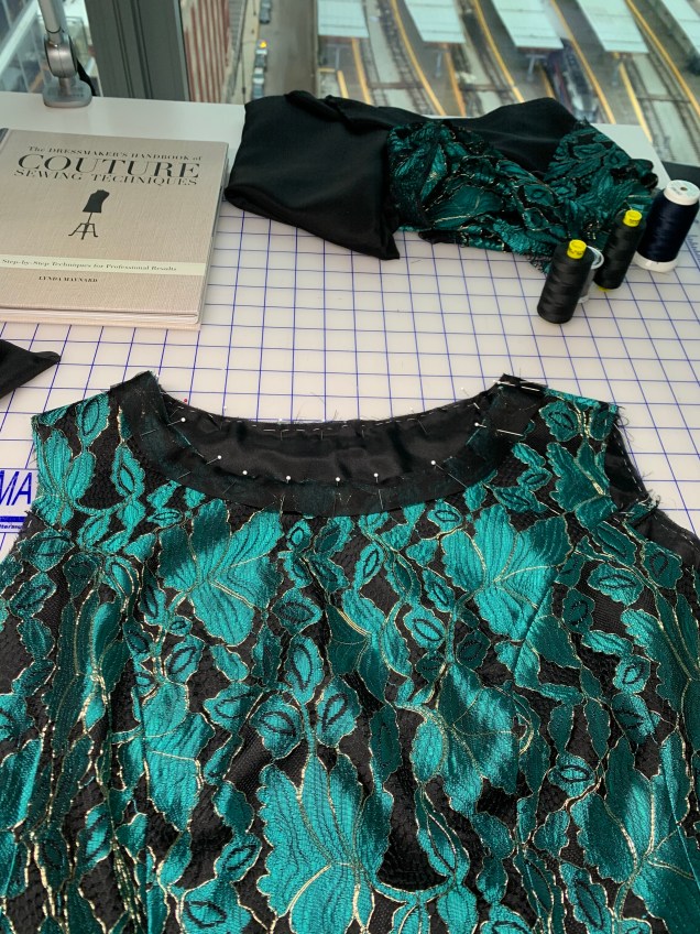 I thought about using a hand rolled narrow hem, but with the underlining a regular hem by hand worked great. For the neckline finish, I made a narrow facing out of silk organza cut on the bias that I steamed to the shape of the patter pieces, then trimmed to size and stitched together at the shoulders. Once it was sewn in place, pressed and understitched, I sewed the bottom edge to the underlining by hand.